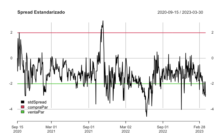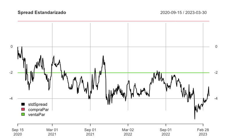 Si bien lo vemos sobre el mínimo de -2 desvíos del spread estandarizado, parece ser bastante estable. Recordemos que el cálculo es el spread dividido el desvío estandard de ambos retornos. De esta manera estamos "normalizando" por las variaciones que experimenta ambas cotizaciones y por ende intentamos construir un intérvalo que contenga, con mucha más probabilidad, a la media.