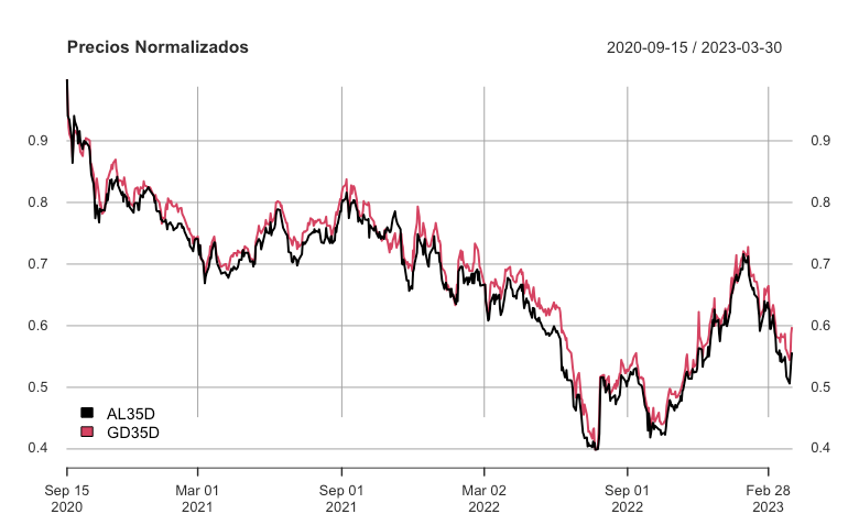 Presentamos la evolución del precio estandarizado y comparado entre los dos bonos.