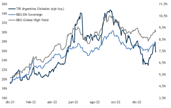 Si bien los dólares financieros muestran estabilidad (operando sin superar la zona de los $ 370 para el CCL, reduciendo así la brecha a la zona sub 90%, la presión irá en aumento a medida que la sequía (+heladas) vaya impactando en el día a día de las liquidaciones del sector campo (por mas que el Dólar Soja 3.0 sea casi un hecho). Creemos que el relajamiento de las metas con el FMI para el 1T2023 tendrán un efecto limitado, las dólares no pueden aparecer por arte de magia, pese a la imagen de “mago con varios conejos en la galera” que suele rodear a Massa. Así y todo, con inflación en alza, actores económicos cautivos y el calendario electoral reduciendo duration en ARS, creemos seguirá la demanda por títulos cortos en moneda nacional, donde FCIs de Money Market o Caución Bursátil a 1d / 7d pueden ir ganando terreno en los portfolios.