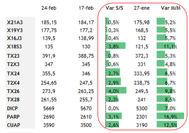 Bonos en moneda nacional con otra dinámica. Alejados de la alta volatilidad de la deuda soberana hard-dollar, los títulos en pesos operaron sostenidos durante la semana, incluso algunos tramos por los que hasta ahora el mercado no mostraba interés. En este aspecto, llamó la atención la deuda CER post 2023, donde los agentes económicos habían sido reacios a financiar la transición presidencial y el primero año de la nueva administración. Sólo el BCRA operaba en los bids de títulos como TX24 y T2X4, territorio donde ninguna licitación de Economía se animaba a aventurarse. La bonanza fue mas allá y llegó hasta los tramos medios-largos (TX26 / TX28) e incluso los de mayor duration como PARP y CUAP. En resumen, la semana vio subas promedio de casi 3% entre ambas puntas de la curva. Si nos extendemos al último mes calendario, las subas (promedio) llegaron al 10%, superando por lejos el carry del período y mostrando clara compresión de tasas. Factores detrás de la buena performance ARS? Podemos identificar tres, con efectos distintos en cada uno de los tramos.