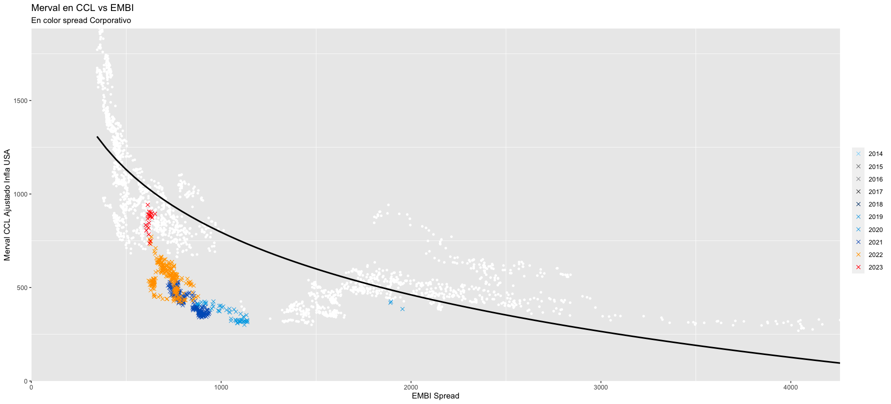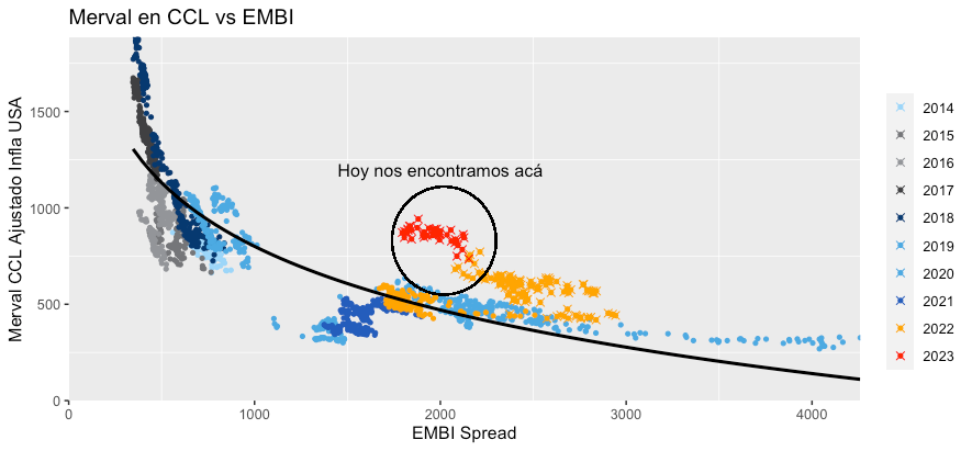 A continuación incluimos un gráfico de Merval medido al CCL (y ajustado por la inflación de USA) vs Riesgo País (índice EMBI de JP Morgan).