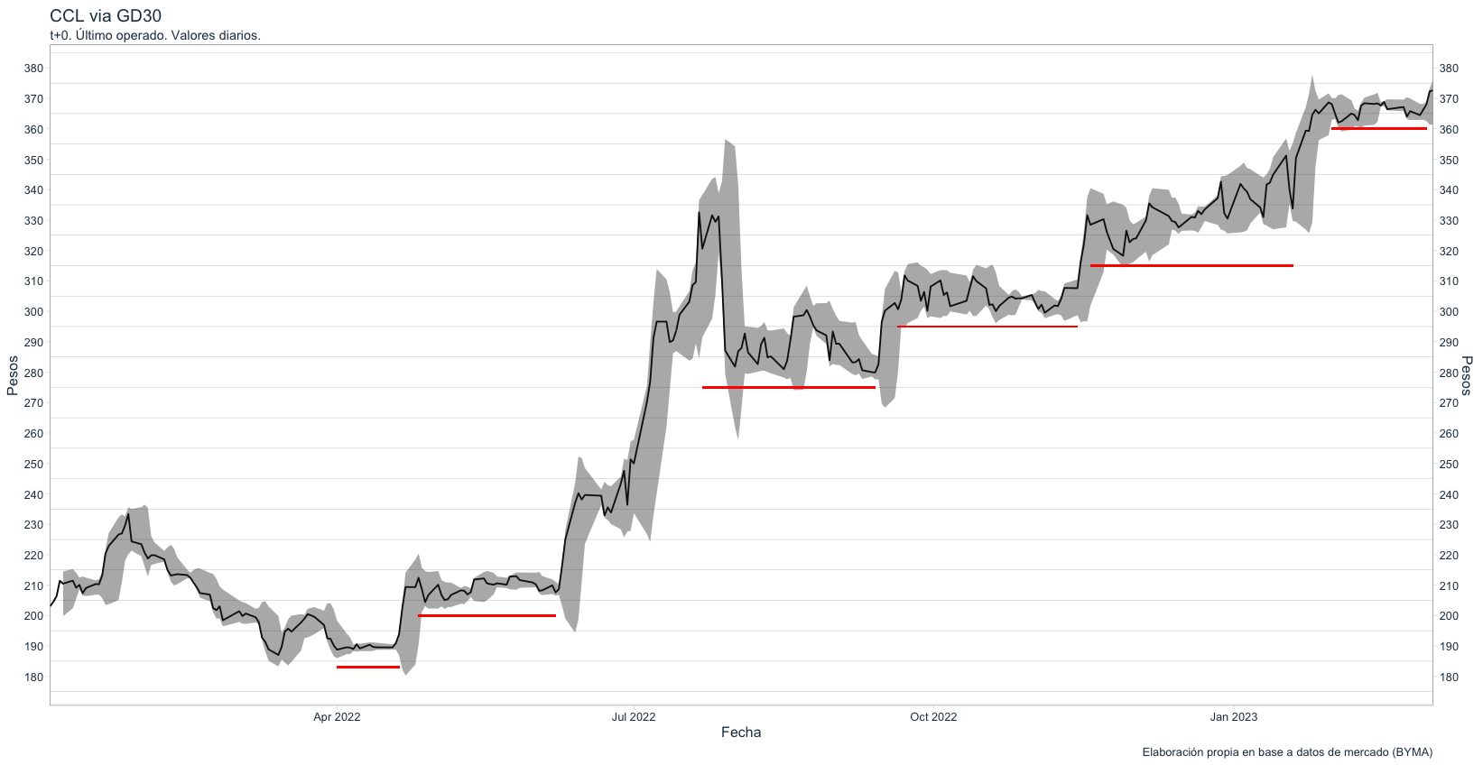 ¿Se despiertan los dólares implícitos? Mientras el tipo de cambio oficial juega su propio partido e intentamos analizar su comportamiento reciente y a la vez proyectar lo que pueda hacer de aquí en mas, los dólares financieros parecieran querer despertarse tras varias semanas de comportamiento lateral. El reciente menor ritmo de depreciación del peso impuesto por el BCRA, podríamos pensar, obedece al comportamiento típico en año electoral (atrasándolo para crear un sentimiento artificial de mayor bienestar económico), mientras CCL y MEP avanzaron casi 3% en la semana, con la brecha rebotando al 88%. ¿Comienzo de un nuevo ciclo de subas? No podemos afirmarlo pero sí basarnos en la evidencia empírica. Como vemos en el gráfico inferior, fueron varios los lapsos donde el CCL lateralizó por un tiempo y luego cortó al alza. Con inflación corriendo al 6% mensual es hasta lógico que en algún momento haga ese cath-up.