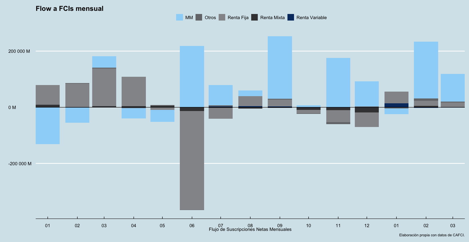 La tercera pata para completar el análisis nos llevaría a pensar si la demanda sobre el tramo medio CER no está digitada desde organismos públicos a fin de hacer mas tentador el potencial canje, algo que hasta tendría cierta lógica de mercado, digamos. Pensar en lanzar semejante mega operación dos semanas atrás hubiera sido de imposible cumplimiento con ese nivel de tasas. No tenemos la respuesta mas allá de especulaciones pero lo cierto es que el prestamista de última instancia (BCRA) se corrió de la primera línea de bids y que los FCIS (por fuera de los Money-Market, básicamente Renta Fija) vienen recibiendo suscripciones netas desde hace varias semanas, según podemos observar en el cuadro inferior. Sin llegar a ser flujos significativos, la demanda del sector privado parece presente.