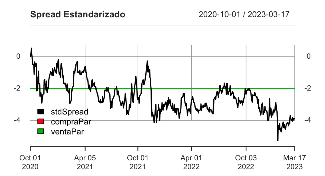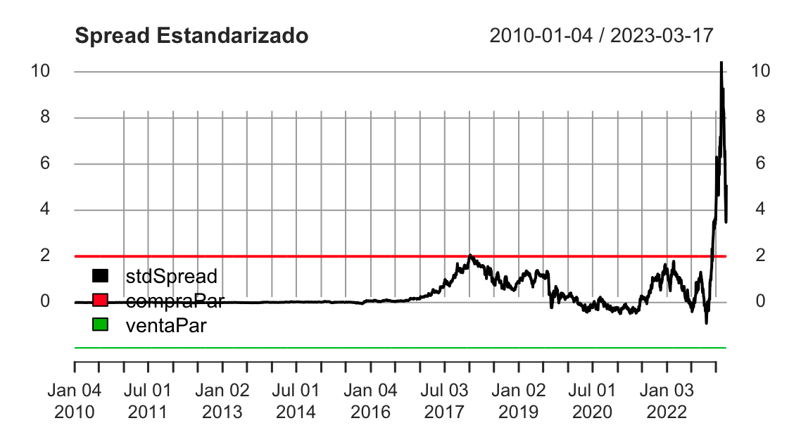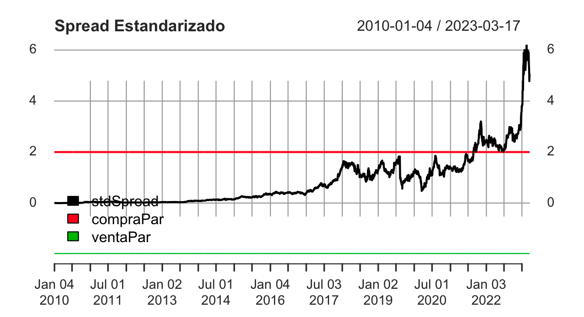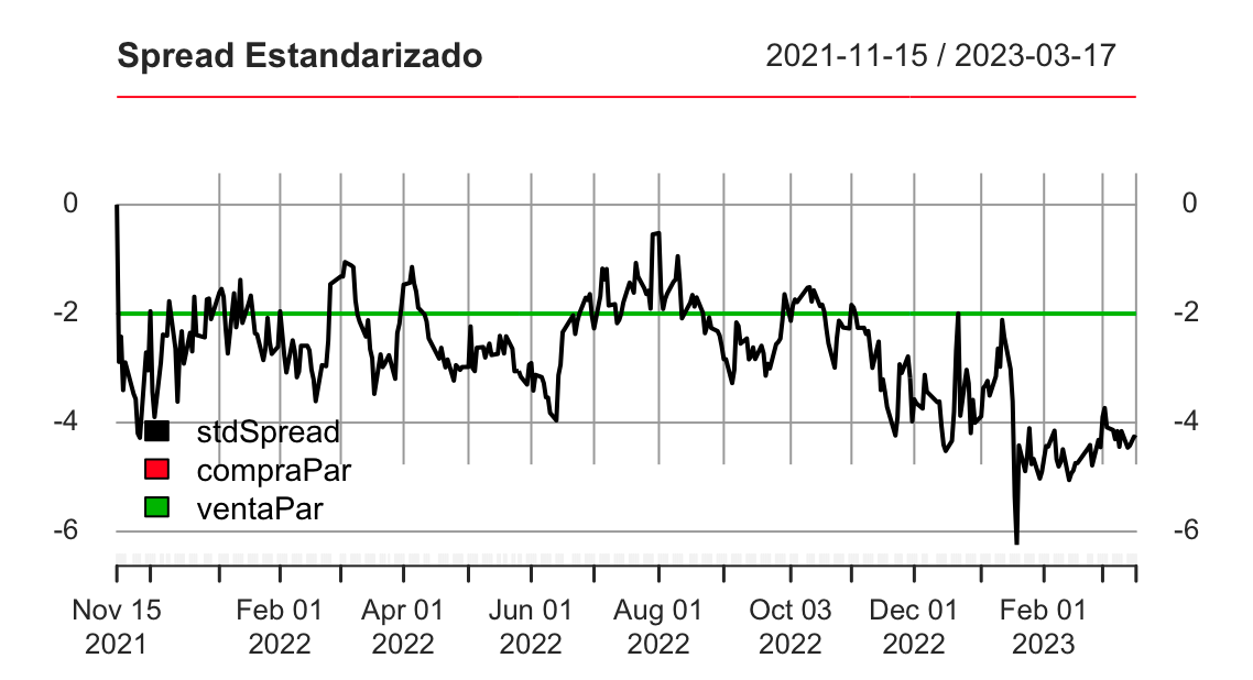 Como se puede ver en el gráfico de arriba, el spread hace un intento de retornar a la "media" sobre octubre 2021. Allí podría haberse abierto una estrategia entre el inicio (oct-20) y oct-21.