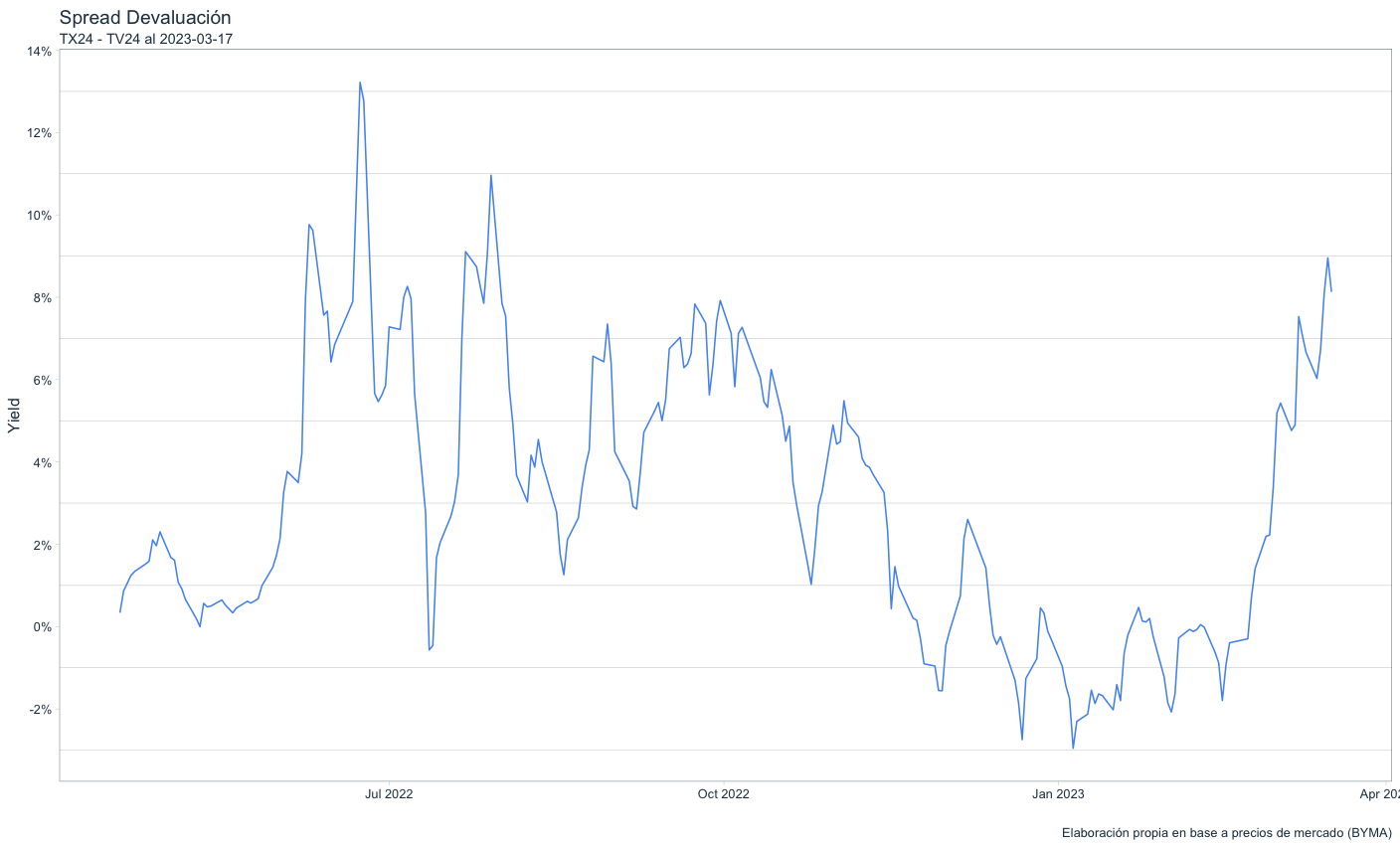En línea con lo anterior, el "spread devaluación" continua nuevamente en aumento como muestra este gráfico: