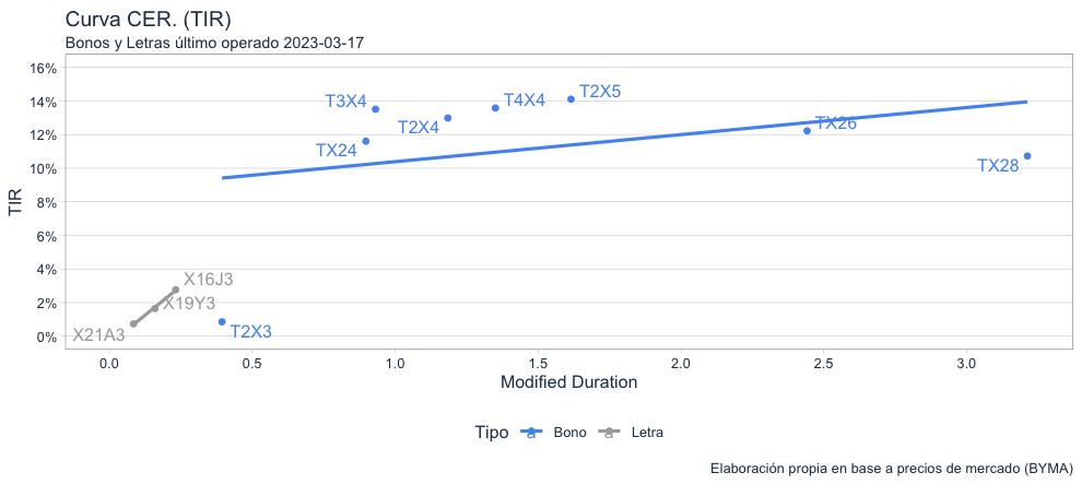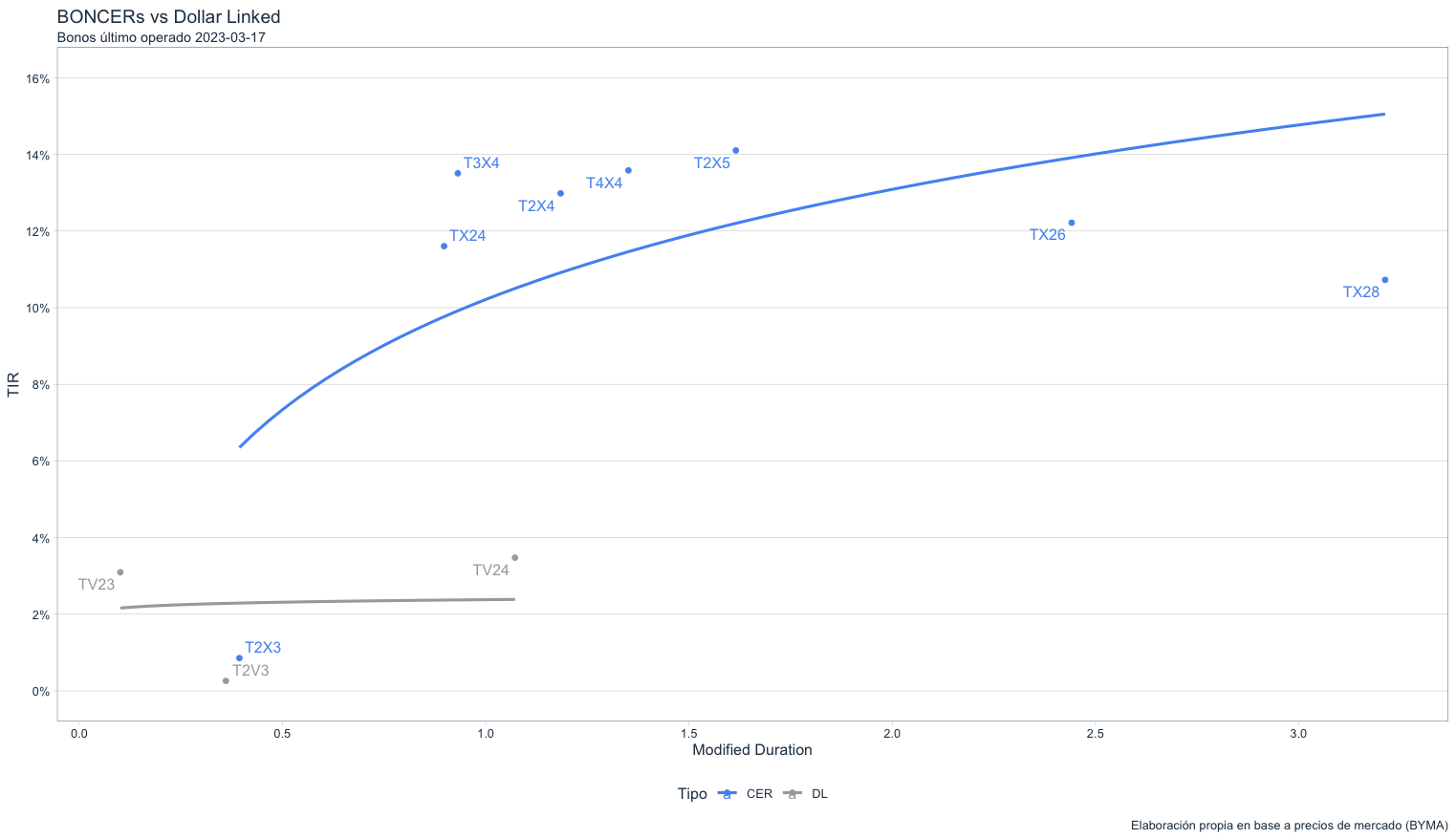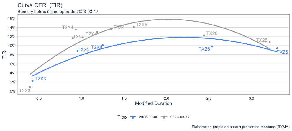 El “Rubicón” 2024 vuelve a estar presente en la curva CER. Uno de los temores del mercado previo al (fallido en nuestros términos) canje de deuda en pesos anunciado el 06-mar era que post swap, y viendo como venían operando los bonos 2024 en el mercado secundario, los precios cayeran y las tasas por ende, subieran. Las suspicacias respecto a “acomodar” un poco la foto en la previa estaban a la orden del día. Los temores se hicieron realidad y los rendimientos se dispararon ~300 pbs. en los títulos venciendo en el crucial 2024. Los spreads contra 2023 volvieron a ampliarse.