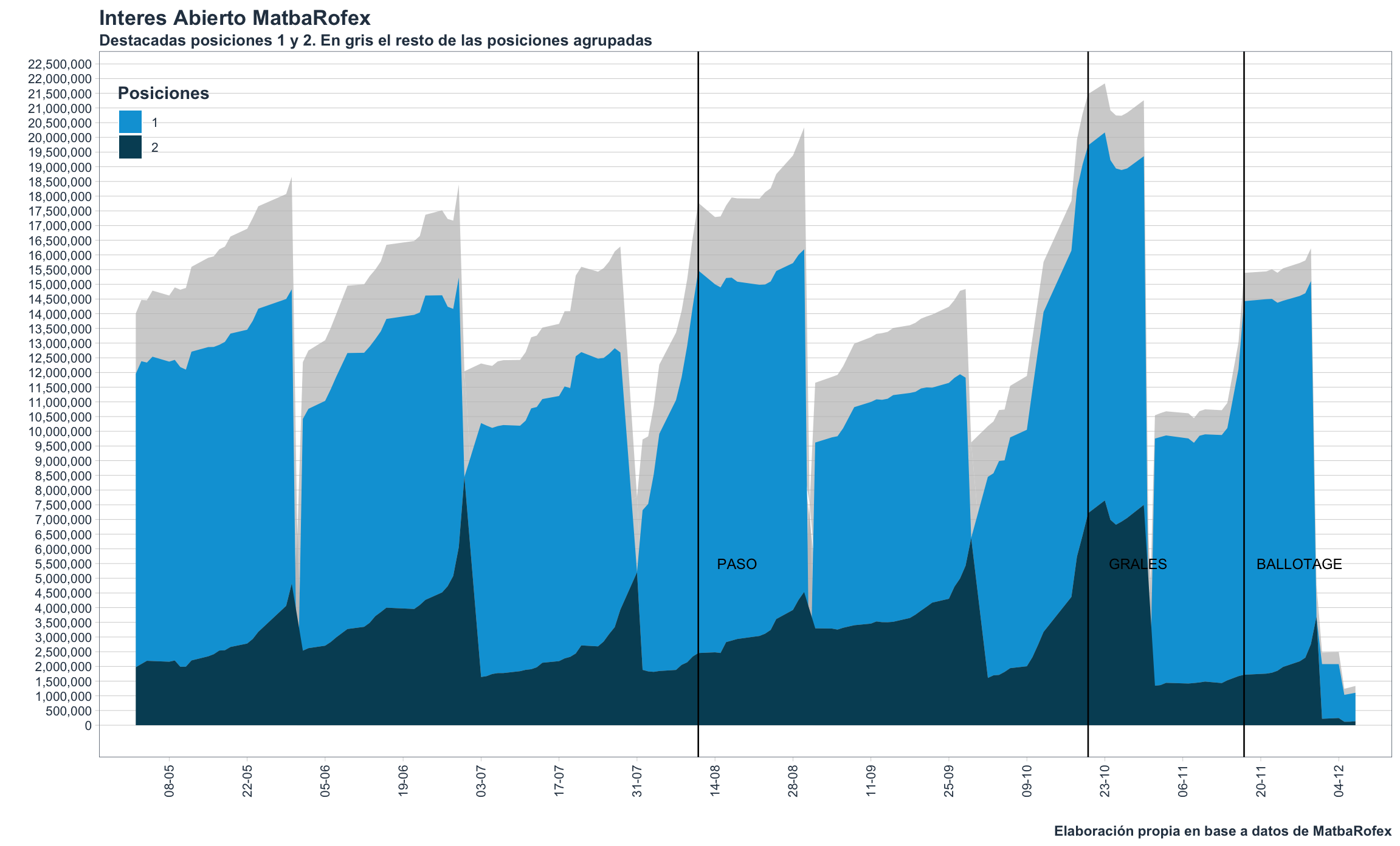 Futuros con grandes dudas. Continuó la incertidumbre en los futuros. Diciembre cerró cerca del mínimo del día, ajustando 15 $ en 755, pero no sin antes tocar 785. El volumen operado no estuvo a la altura de tanta volatilidad. Lo cierto es que ni bien trascendía una idea de cómo podría operarse el día lunes, los futuros respondían en consecuencia. La incertidumbre no es buena planteando estrategias. Nuevamente +75% del volumen concentrado en diciembre. El nivel de interés abierto es mínimo (ver gráfico) en mucho tiempo. No parece quedar mucha cobertura en este mercado de la cuál preocuparse.