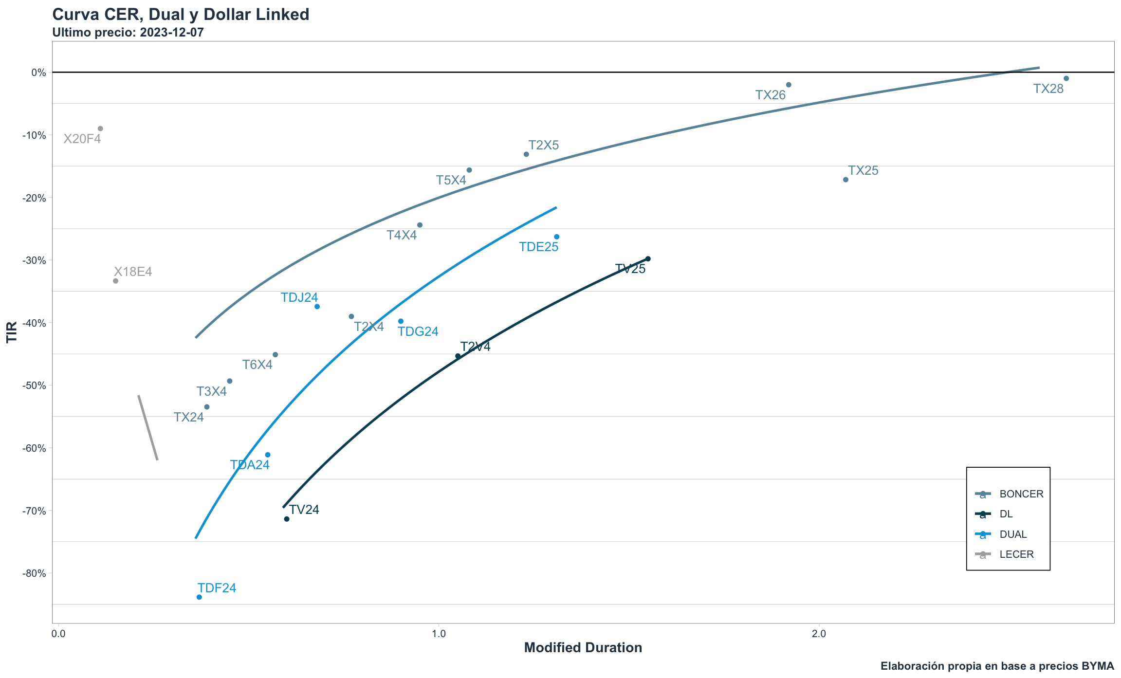 Pongamos en números la magnitud del rally CER y los efectos en las curvas de rendimientos. Los bonos 2024 operan con tasas negativas que van del -16% al -64% (-43% promedio). La paridad promedio de los CER trepó al 129% y es un dato que también debería ser tenido en cuenta si el escenario de dolarización se mantiene vigente. Dos semanas atrás, sólo los primeros tres títulos de la curva operaban con tasa real negativa. En este lapso y para ese tramo, la compresión de spreads fue de 4.000 pbs. Los niveles alcanzados al jueves, desde ya, son récord absoluto. Tenemos que irnos al DICP (vencimiento 2033) para encontrar menos de 4 p.p. de tasa real positiva. Tal fue el ajuste de rendimientos en los CER que su curva de rendimiento se solapó con la de Duales bajo ajuste de inflación en los títulos de jun-24 y ago-24. En la “pata” Dollar-Linked, el valor de hoy del Dólar A3500 les quita toda certidumbre en la valuación, favoreciendo la opcionalidad CER. Suponiendo no se modifique el mencionado tipo de cambio para el cálculo de los flujos de Duales y DLs, y pensando en un tipo de cambio de $ 650 (sumamente optimista para febrero del año que viene), el rendimiento del TDF24 pasa de -136% a +20%. Mientras que pensando en una inflación de 40% para el período nov-23 / ene-24, la opción CER del TDF24 todavía operaría con rendimiento negativo de -63%.