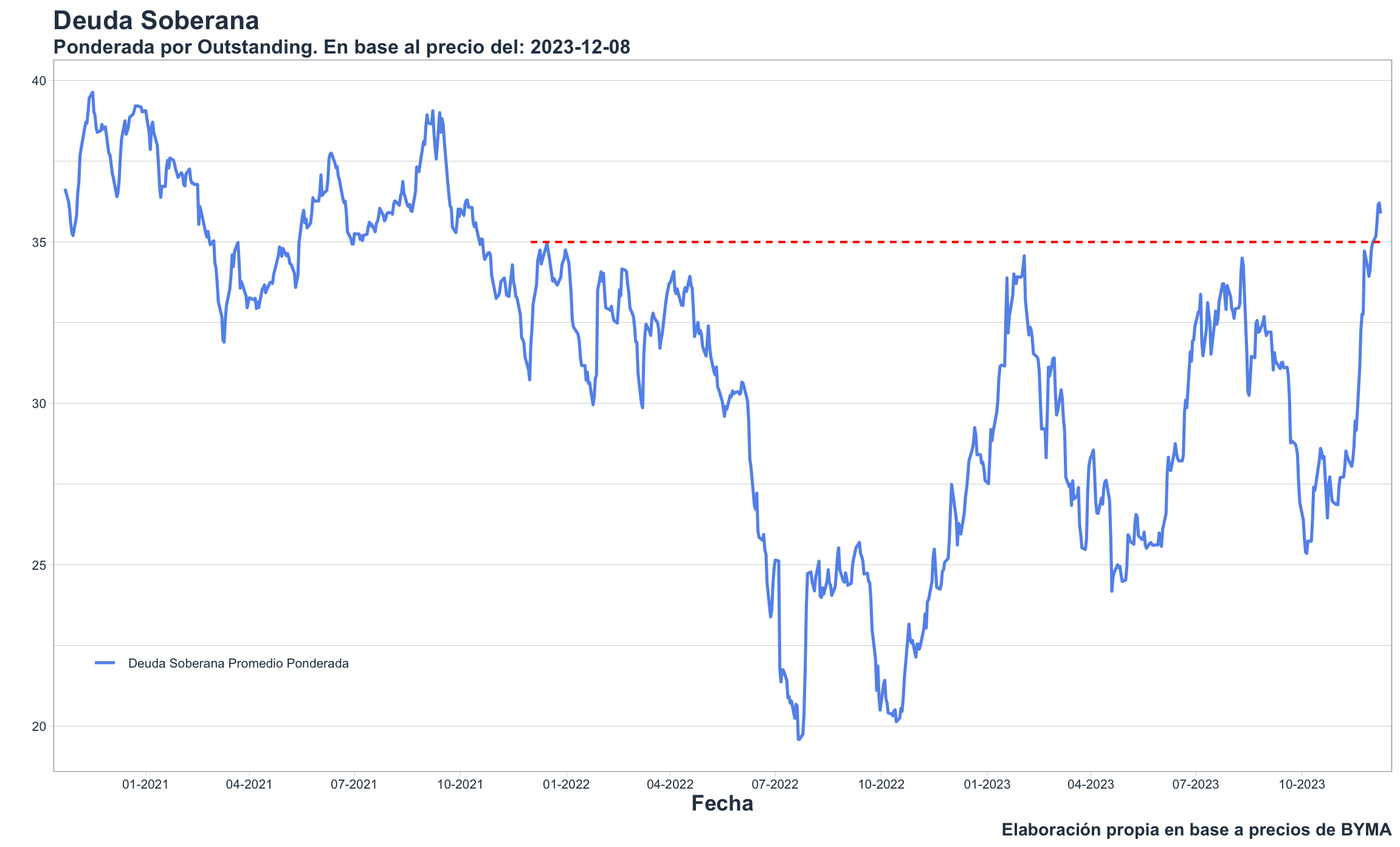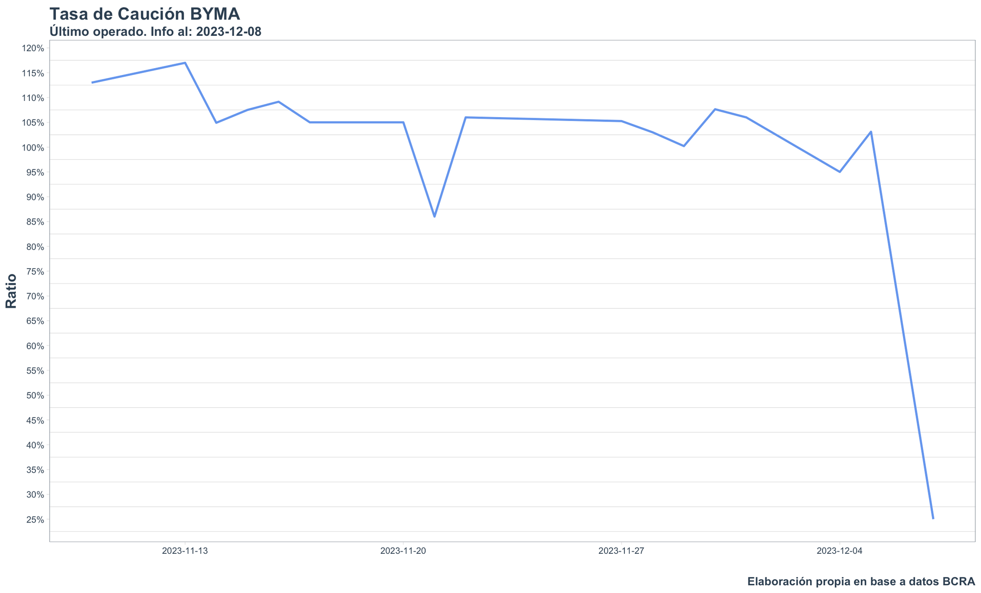 ¿Qué hacemos con los pesos? Tasas negativas nunca vistas para bonos indexados a la inflación y ajustables al tipo de cambio. El fenómeno visto en algunos sectores del consumo pareciera haber llegado a los bonos en moneda nacional. En contextos de alta inflación (y expectativas crecientes) los pesos “queman” y deben ser gastados antes que pierdan mayor valor. El rally reciente de los bonos ARS puede, en nuestra opinión, al menos explicarse parcialmente en esta conducta. Los temores a la dolarización inminente de la economía parecen haberse descartado (aunque no eliminados completamente en nuestra visión), eso nos marcan los máximos alcanzados en los precios. Esta era (y es) la condición necesaria para apuntalar las valuaciones. Pero no explica la totalidad del rush alcista. Aquí entra nuestro rationale símil efecto “restoranes llenos”, los pesos hay que gastarlos, y para quienes manejan inversiones, esos pesos necesitan indefectiblemente ser colocados. Pero estamos seguros que tan significativo movimiento no se hubiera llevado a cabo en la previa de un cambio de gobierno de la relevancia del actual, donde las incógnitas dominan por completo a las certezas. A juzgar por el comportamiento en las acciones bancarias y los mismos bonos en pesos, el mercado descarta completamente un escenario disruptivo. Desde ya que no podemos darlo por verdad absoluta, el ejemplo en la previa a las PASO 2019 todavía está fresco. Mas allá de la plena confianza que pareciera emanar de los precios de estos activos, al jueves nadie quería quedarse sin destino para esos pesos, que buscaron donde colocarse a cómo sea. El hundimiento de la tasa de Caución Bursátil a 1d al 25% en las últimas operaciones del jueves así lo testimonian. Aquí también pudo darse un efecto de rotación desde FCIs de money-market hacia las colocaciones bursátiles, instrumentos a priori al margen de cualquier solución inmediata y disruptiva para los bancos con el “problema de las Leliqs (Pases)”. Otro aspecto derivado de la demanda en instrumentos indexados a la inflación minorista está relacionado a registros de inflación en ascenso. Dato de CABA para nov-23 arrojó una suba de 11,9%, y podría esperarse un número similar a nivel nacional. Para diciembre y enero 2024 ya se habla de valores con piso en 20%, aunque resulta imposible poner un número lógico en el actual escenario e incertidumbre.
