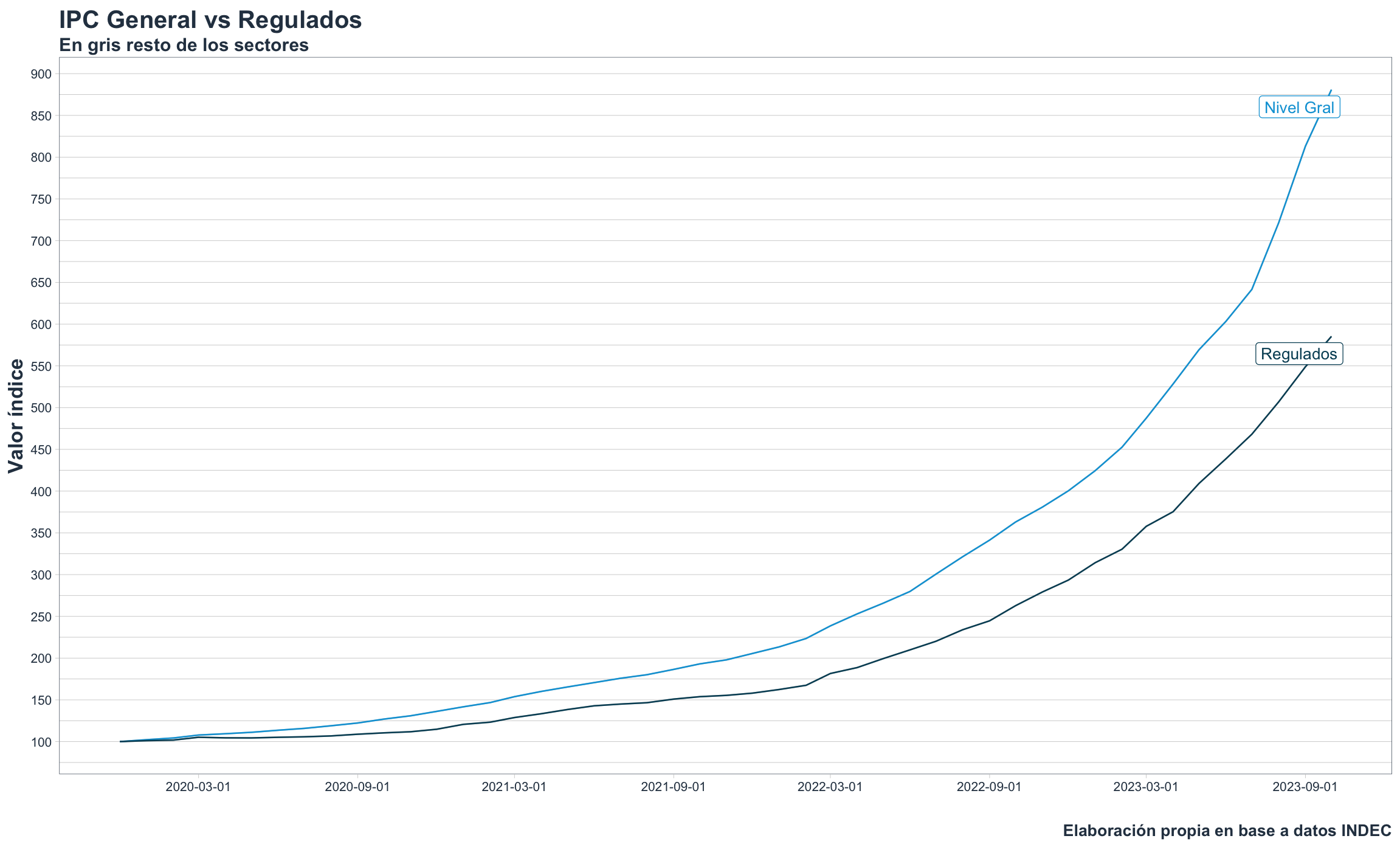 Ajuste de precios relativos. Antes o después. El gráfico (debajo) es elocuente: la inflación no fue mayor debido a que los precios "regulados" corrieron por debajo de la inflación. Y eso, quizás, sea la definición de "Regulados" a la vista de nuestro pasado de unos, ya, bastantes años. La idea detrás de regular ciertos precios es la de esconder ciertas deficiencias en la generación de ese bien, que se exacerba a raíz del constante capricho de creer que conteniendo el tipo de cambio nominal se puede vivir mejor. Esto nos lleva a un ciclo, que se va a repetir de manera muy clara esta vez, al igual que el que se inició en 2016. Un gobierno se empecina en atrasar el tipo de cambio, genera distorsión de precios relativos dado que algunos precios no pueden subir lo que deberían debido a la regulación. Luego viene un gobierno que opina distinto, y tiene que generar que los precios relativos se vuelvan a "acomodar" unos en función de otros. Condición sine qua non para que la oferta de éstos, y la demanda, se equilibren en un nivel adecuado que brinde continuidad a ese mercado. O que el presupuesto con el que cuenta la nueva administración tenga lugar para hacerse cargo de la diferencia. O que tenga cómo financiarla. O ambas. O ninguna. Tal y cómo llegamos hasta acá.