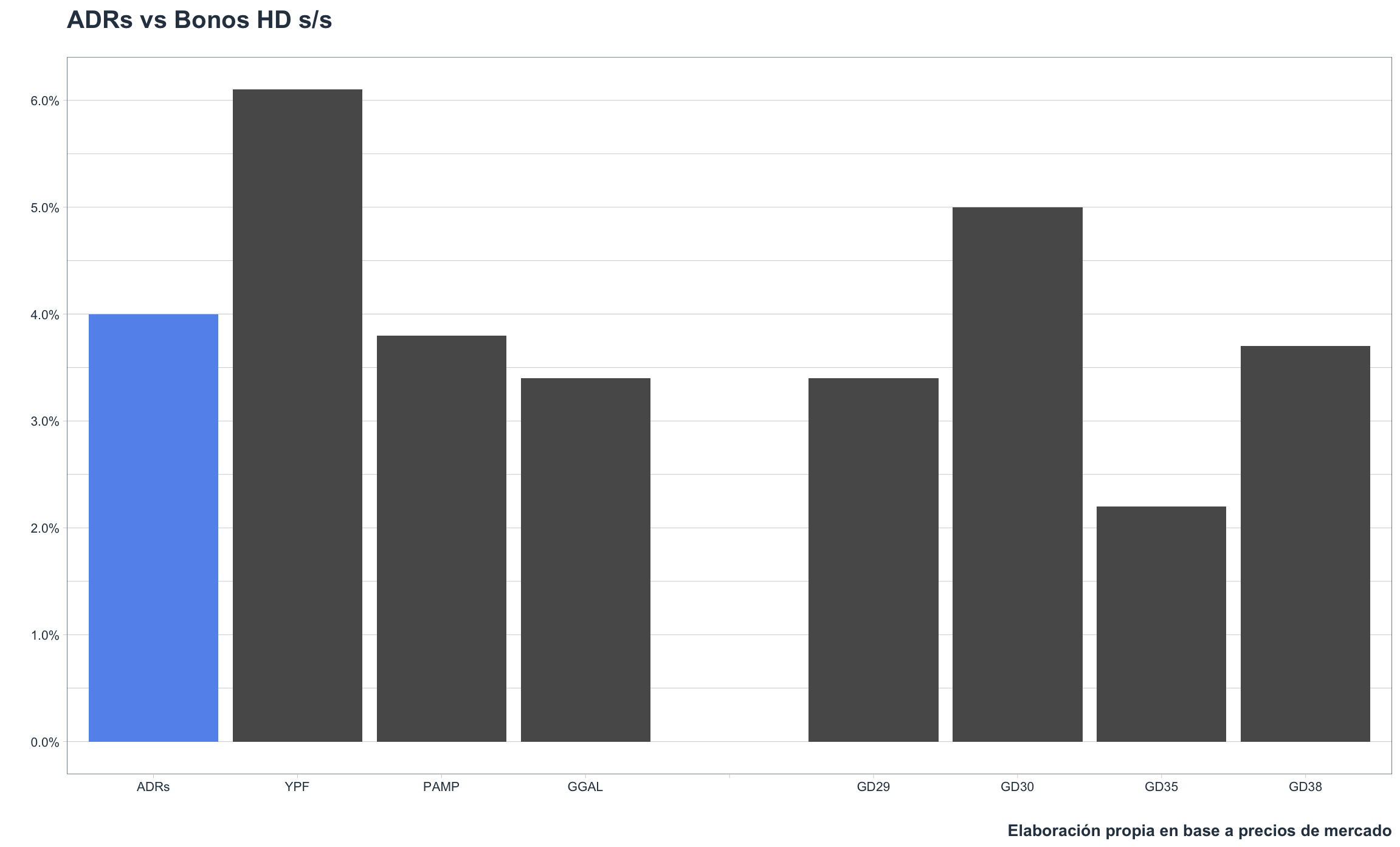 ADRs ahora en sintonía, también se destacan del contexto. Si bien el S&P Merval finalizó la semana con leve baja medido en dólares (pese a la gran performance de papeles locales como TXAR, ALUA o BYMA), los ADRs treparon 3,2% en promedio. Al igual que como viene ocurriendo, seguimos viendo gran dispersión entre papeles y sectores. Los bancos son el principal termómetro de expectativas y en este aspecto alternaron subas y bajas semanales, aunque el promedio quedó en verde, en gran medida explicado por la muy buena rueda del viernes en USA (aquí feriado) cuando treparon 2,6%. En el sector financiero está uno de los activos en los cuales se refleja que la dolarización hoy no es el escenario base. Las subas recientes parecen no avalar esa posibilidad que a priori podría ser altamente gravosa para los bancos dada su alta exposición a activos del sector público. La renta variable sigue aventajando por varios cuerpos a la renta fija HD, con suba YTD de 59% para la primera vs. +30% de la segunda.