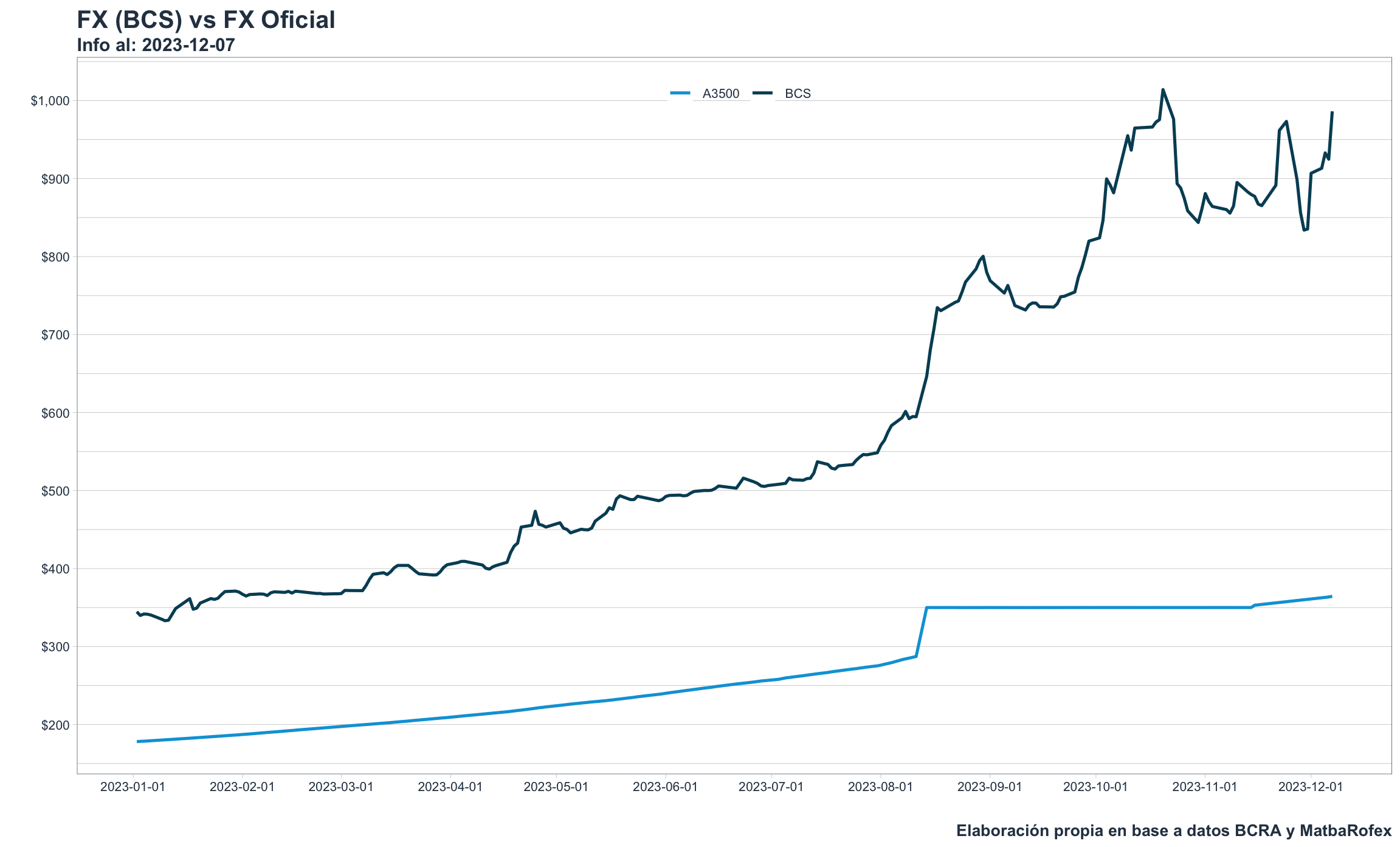 Punto de partida para el FX oficial. ¿Dónde estamos parados para el CCL? Al momento de recibir este informe, lunes a primera hora, podríamos ya empezar a conocer los principales lineamientos en materia económica, financiera y cambiaria. Se desconoce totalmente cuál será el detalle de las medidas, aunque las suposiciones son muchas. Donde sí podemos tener certeza plena es la devaluación del peso, aunque especulamos en rangos para el nuevo valor del dólar. La brecha en 170% ya habla por sí sola. El salto discreto está garantizado, pero desconocemos cómo será el mecanismo de ahí en mas para el dólar comercial y la suerte que vaya a correr el A3500 (lo ocurrido al cierre del jueves en el MAE y el comunicado posterior del BCRA es una postal), cláusula de ajuste de prácticamente todos los contratos ligados a los títulos públicos que toman el tipo de cambio oficial.